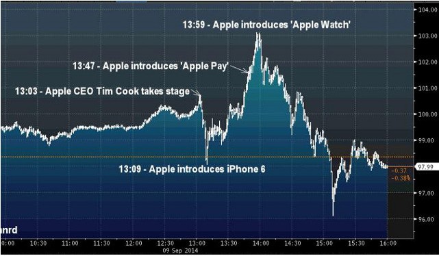 Diễn biến giá cổ phiếu Apple trong thời gian diến ra sự kiện: CEO Tim Cook xuất hiện (13:03) - Giới thiệu iPhone 6 (13:09) - Giới thiệu ứng dụng "Apple Pay" (13:47) - Giới thiệu đồng hồ "Apple Watch" (13:59)