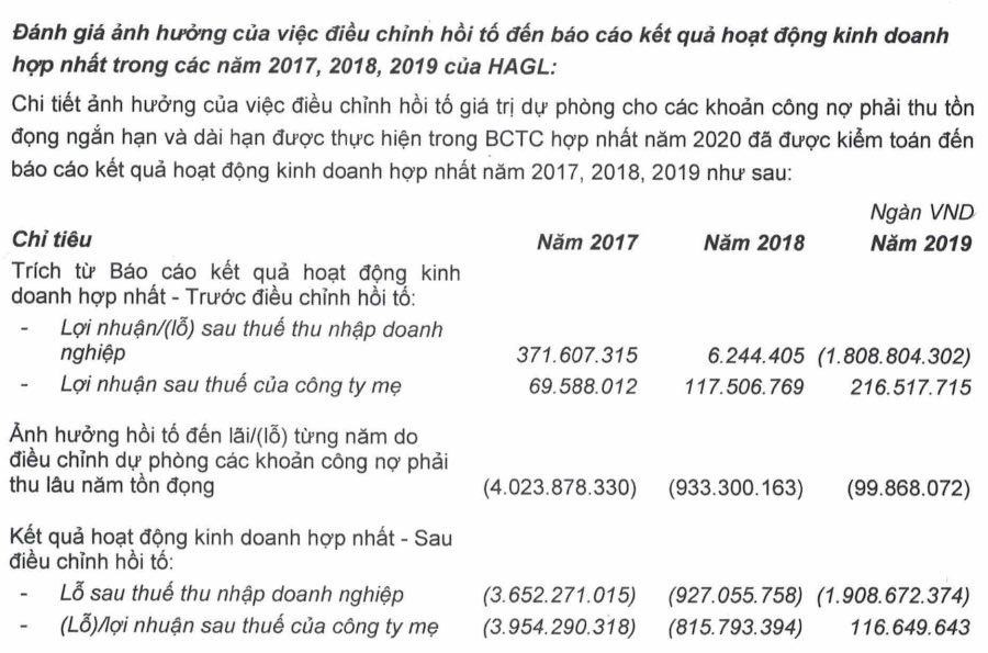 Trên thực tế, mặc dù áp dụng hồi tố nhưng năm 2019 , lợi nhuận sau thuế của cổ đông công ty mẹ trên báo cáo hợp nhất của HAG tuy giảm đi nhưng vẫn là con số dương.