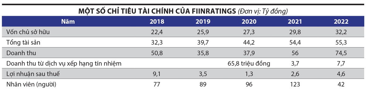 Báo cáo tài chính kiểm toán năm 2022 của Fiin Ratings (báo cáo gần nhất được công bố) cho thấy, năm 2022, Công ty ghi nhận doanh thu 74,5 tỷ đồng, tăng 33% so với năm 2021; lợi nhuận sau thuế đạt 4,6 tỷ đồng, tăng 76,9%.