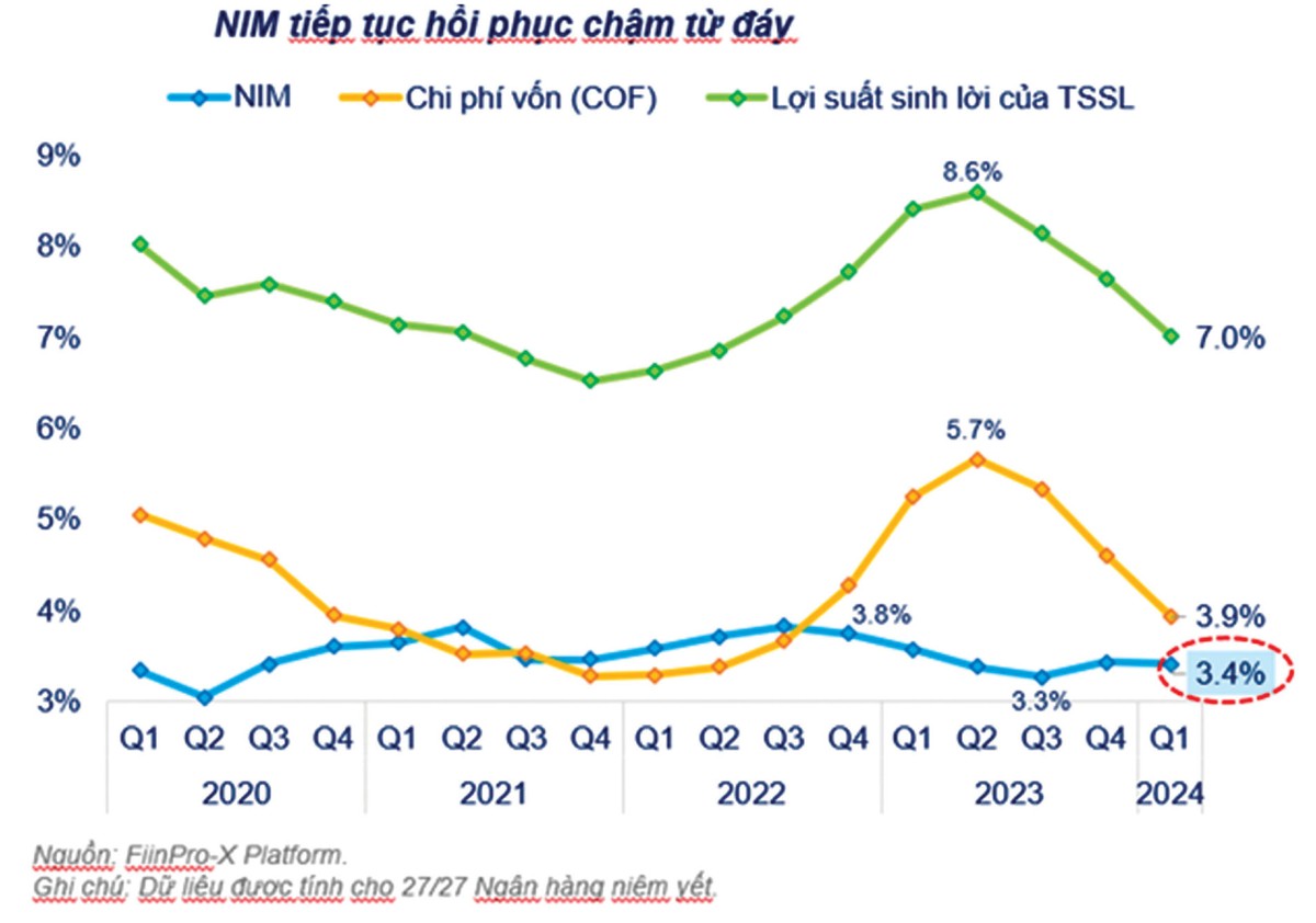 Mặt bằng lãi suất tiết kiệm gần đây tăng khoảng 0,5 - 1%/năm, tùy kỳ hạn và có sự tham gia của cả nhóm ngân hàng quốc doanh và tư nhân. Đây là mức tăng nhẹ từ vùng đáy thiết lập trong tháng 3/2024. Khi mà lãi suất đầu ra không tăng tương ứng trong bối cảnh NHNN chủ trương duy trì lãi suất thấp nhằm hỗ trợ doanh nghiệp và tiếp tục hỗ trợ tháo gỡ khó khăn để thúc đẩy tăng trưởng kinh tế, ổn định kinh tế vĩ mô trong năm 2024, khả năng sinh lời của các ngân hàng có thêm thách thức và NIM của ngành ngân hàng có thể bị thu hẹp.