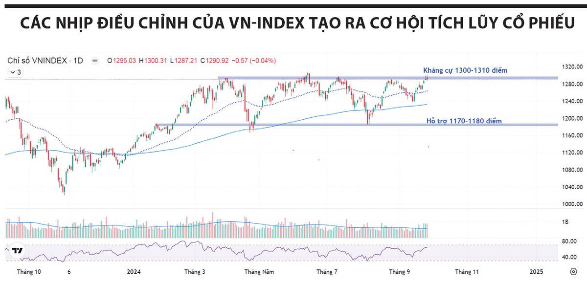 Với việc VN-Index đang giằng co tại ngưỡng kháng cự lịch sử 1.300 điểm, không loại trừ khả năng chỉ số sẽ có nhịp điều chỉnh để thu hút thêm dòng tiền chờ sẵn tại vùng 1.270 - 1.280 điểm. Các nhịp điều chỉnh nếu xảy ra sẽ là cơ hội cho nhà đầu tư gia tăng tỷ trọng cổ phiếu để đón kết quả kinh doanh quý III sắp tới.