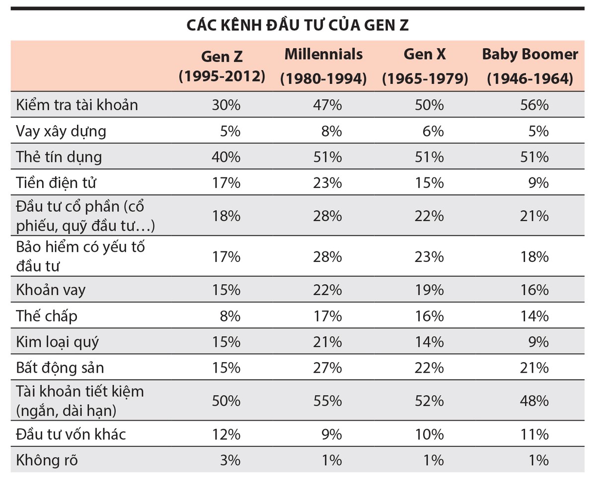 Hiện Gen Z dành đến 32% thu nhập cho tiết kiệm và tìm kiếm các cơ hội đầu tư để xây dựng tài sản bền vững. Họ không chỉ chú trọng vào việc kiếm tiền, mà còn nghiên cứu các phương pháp đầu tư và quản lý tài chính thông minh. Họ đang tích cực tham gia vào thị trường đầu tư thông qua các công cụ tài chính hiện đại như ứng dụng quản lý quỹ, ví điện tử và nền tảng giao dịch trực tuyến. Các kênh đầu tư phổ biến hiện nay bao gồm gửi tiết kiệm, mua cổ phiếu, chứng chỉ quỹ, blockchain và crypto, bất động sản. Gen Z cũng tận dụng các chương trình chiết khấu, hoàn tiền từ thanh toán trực tuyến để tối ưu hóa chi tiêu và tích lũy tài sản.