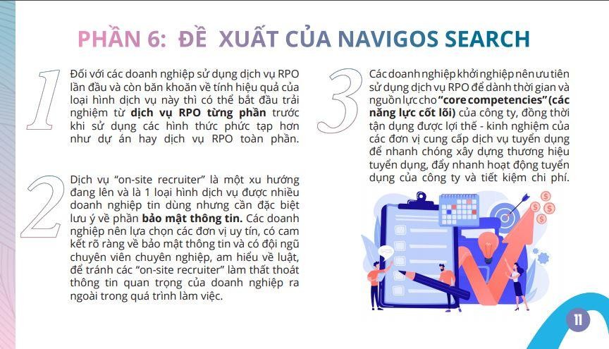 Do chất lượng tốt của các “on-site recruiter” (chuyên gia tuyển dụng của công ty cung cấp dịch vụ RPO trực tiếp làm việc tại doanh nghiệp của khách hàng) về hiệu quả làm việc, tốc độ tìm ứng viên nhanh và phù hợp cũng như tiết kiệm được chi phí khi sử dụng dịch vụ RPO, Navigos Search đang chứng kiến nhu cầu ngày càng gia tăng từ các khách hàng sử dụng dịch vụ RPO.