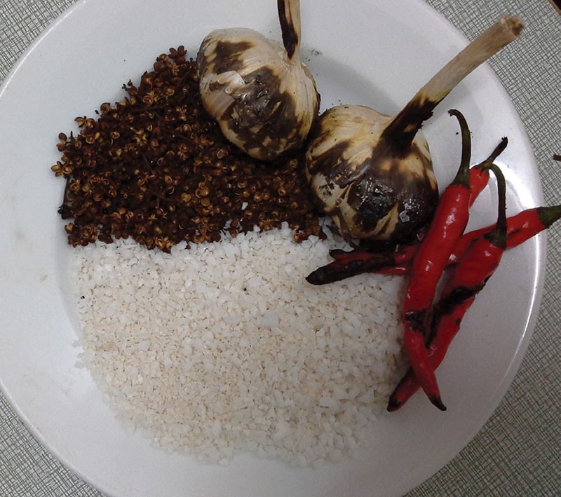 Cái lạ và độc của thịt trâu gác bếp cũng chính là nằm ở đây, những gia vị đặc trưng của vùng cao như ớt, tiêu, gừng, xả, hành, tỏi, hạt dổi…, đặc biệt là mắc khén - một loại tiêu đen của của núi rừng và được coi là “linh hồn” của ẩm thực Tây Bắc. Mắc khén không cay như ớt, không thơm thoảng như hạt tiêu, mà tạo ra sự tê rân rân khi chạm vào đầu lưỡi với hương thơm nồng nàn. Chính gia vị này đã tạo cho món thịt trâu gác bếp hương vị rất đặc biệt, khó mà nhầm lẫn được.