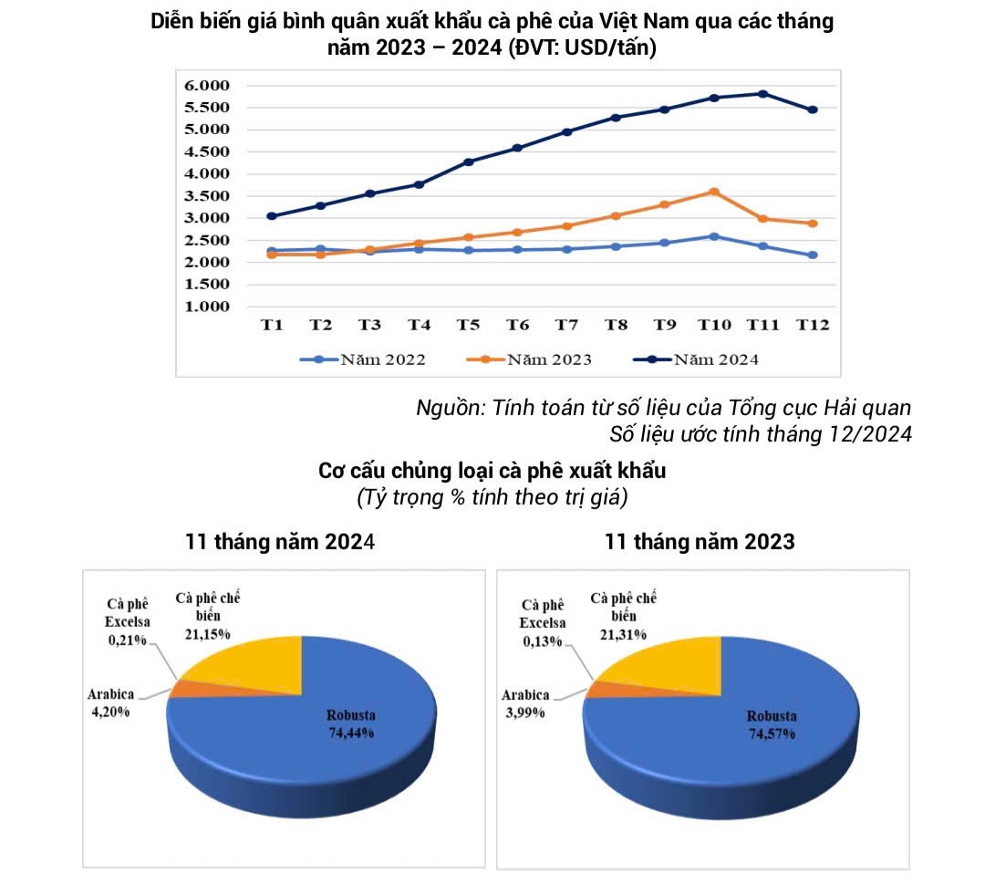 Trong tháng 12/2024, giá bình quân cà phê xuất khẩu của Việt Nam ước đạt 5.450 USD/tấn, giảm nhẹ 2,3% so với tháng 11/2024, tuy nhiên so với tháng 12/2023 tăng mạnh 88,8%. Tính chung cả năm 2024, giá bình quân cà phê xuất khẩu ước đạt 4.158 USD/tấn, tăng 59,1% so với năm 2023.