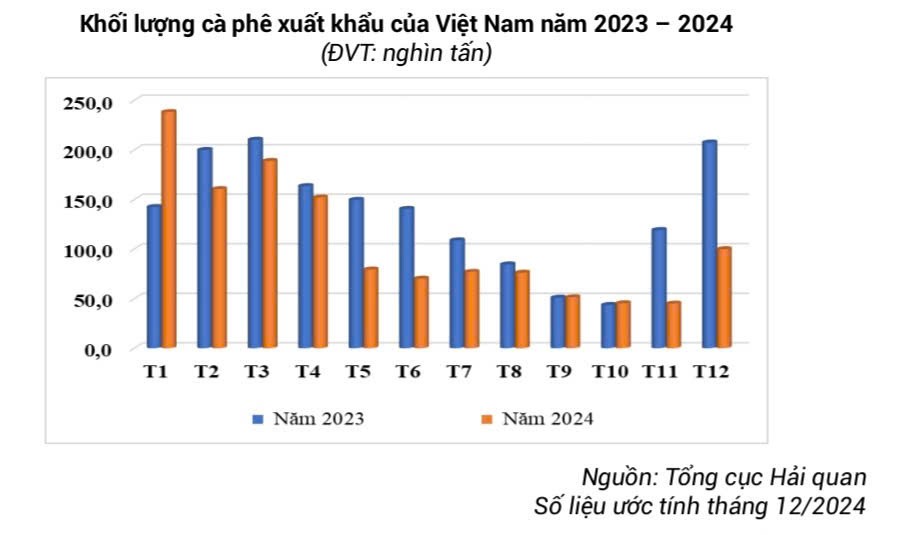 Tính chung cả năm 2024, xuất khẩu cà phê của Việt Nam ước đạt 1,32 triệu tấn, trị giá 5,48 tỷ USD, giảm 18,8% về lượng, nhưng tăng 29,1% về trị giá so với năm 2023.
