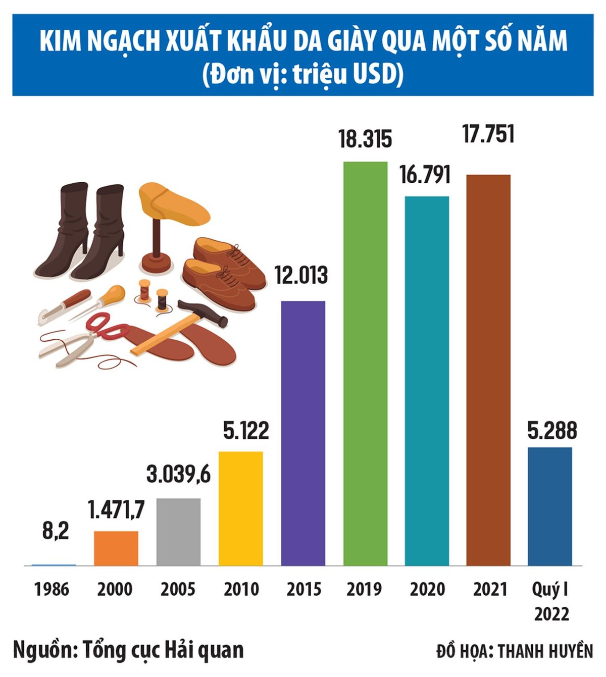 Từ năm 1998, giày dép đã tham gia “câu lạc bộ” các mặt hàng đạt kim ngạch xuất khẩu từ 1 tỷ USD trở lên và nhanh chóng “ghi danh” trong nhóm có kim ngạch cao. Kim ngạch xuất khẩu giày dép đạt trên 2 tỷ USD vào năm 2003, trên 5 tỷ USD vào năm 2010, trên 10 tỷ USD vào năm 2014, trên 17,7 tỷ USD vào năm 2021, chiếm khoảng 5,3% tổng kim ngạch xuất khẩu của cả nước.