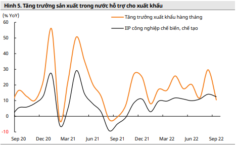 Mirae Asset đánh giá, mặc dù tiêu dùng toàn cầu tiếp tục có dấu hiệu sụt giảm, xung đột giữa Ukraine và Nga vẫn leo thang, và mùa đông trên thế giới đang đến gần, xuất khẩu của Việt Nam vẫn đang có những lợi thế nhất định, nhờ vào năng lực sản xuất và môi trường vĩ mô ổn định. Cụ thể, trong tháng 9, chỉ số sản xuất công nghiệp (IIP) của các ngành công nghiệp chế biến chế tạo tăng đến 16,3% (lũy kế 9 tháng tăng 10,7%).