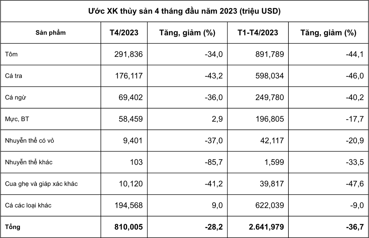 Tình trạng đó khiến cho xuất khẩu thủy sản của Việt Nam sang Mỹ duy trì mức giảm sâu 51% trong tháng 4, khiến Mỹ rớt xuống vị trí thứ 3 trong các thị trường nhập khẩu thủy sản, sau Nhật Bản và Trung Quốc. Lũy kế 4 tháng đầu năm 2023, xuất khẩu thủy sản sang Mỹ ước đạt 418 triệu USD, giảm trên 57% so với cùng kỳ.