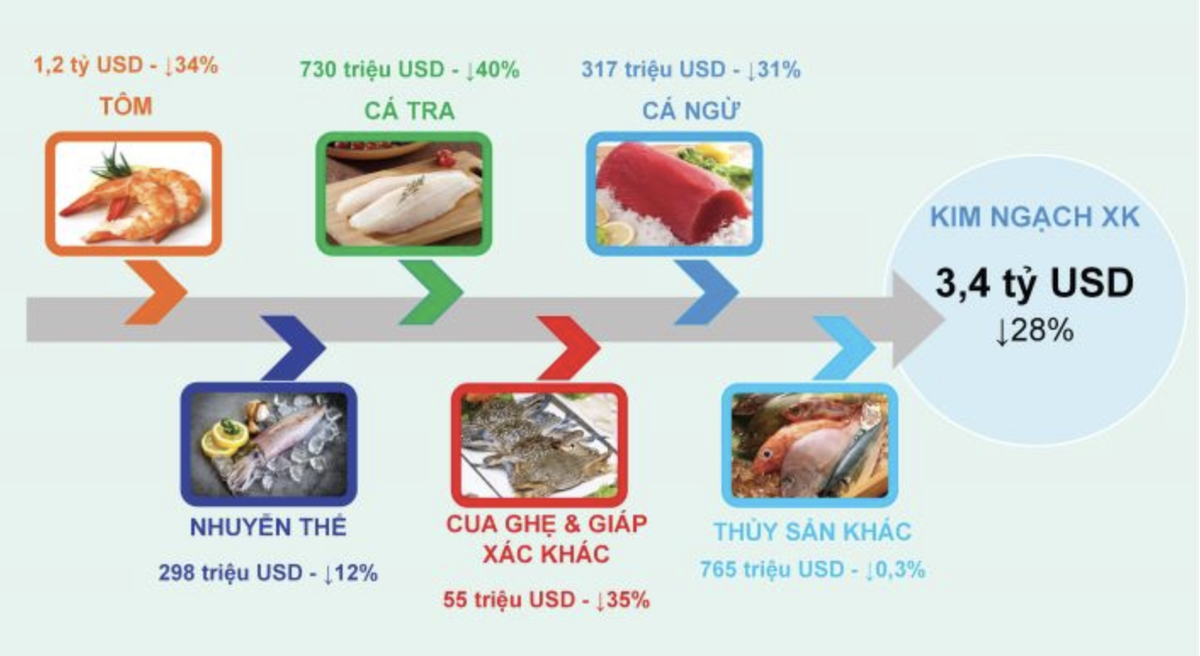 Theo thông tin từ Hiệp hội Chế biến và Xuất khẩu Thuỷ sản Việt Nam (VASEP), trong 5 tháng đầu năm nay, xuất khẩu các mặt hàng thuỷ sản giảm từ 10 - 40% so với cùng kỳ năm ngoái. Trong đó, cá tra giảm sâu nhất tới 40%, tôm giảm 34%, cá ngừ giảm 31%, mực bạch tuộc giảm 12%. Tuy nhiên, vẫn có một số loại cá biển ghi nhận tăng trưởng dương như: cá cơm tăng 53%, cá nục tăng 14%, cá chỉ vàng tăng 20%...
