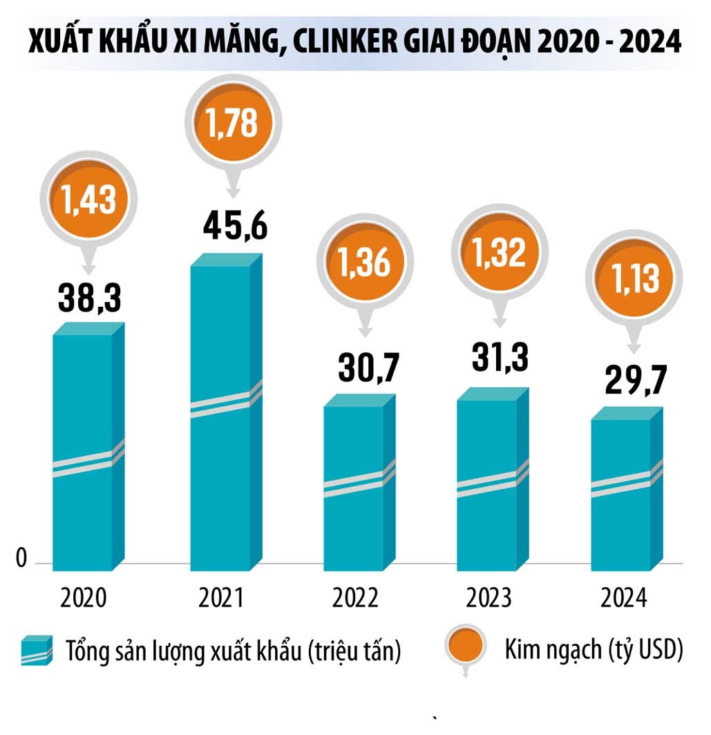 Với nguồn cung dư thừa lớn, khoảng 60 triệu tấn/năm, những năm gần đây, xuất khẩu đã “cứu” cho ngành xi măng sản lượng rất đáng kể, giảm áp lực cạnh tranh nội địa và tồn kho, có dòng tiền trả nợ vốn vay đầu tư. Tuy nhiên, sau năm 2021 lập kỷ lục xuất khẩu thành công hơn 45 triệu tấn, doanh thu đạt gần 1,8 tỷ USD, liên tiếp 3 năm gần đây (2022 - 2024), sản lượng xuất khẩu hàng năm của ngành chỉ còn 29 - 32 triệu tấn.