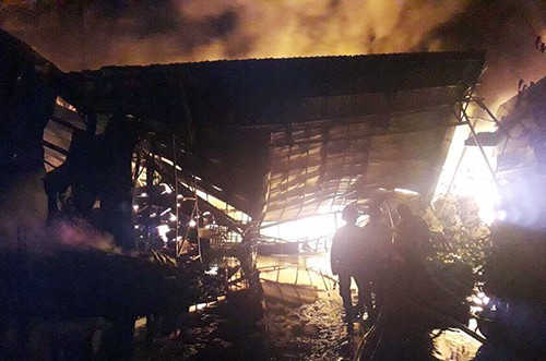 Hiện, lửa vẫn cháy ngùn ngụt, nhiều hạng mục bên trong công ty đổ sập. Lính cứu hoả vẫn miệt mài phun nước.