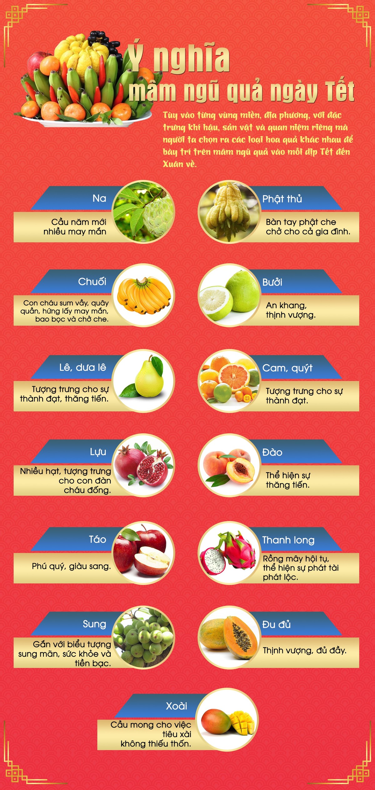(ĐTCK) Mâm ngũ quả là một phần không thể thiếu trong ngày tết cổ truyền của người Việt Nam. Trước là thờ cúng tổ tiên, sau là ước mong năm mới được an khang, thịnh vượng hơn năm trước. Mỗi loại quả khi bày trên ban thờ đều có ý nghĩa riêng, các loại trái cây bày lên thể hiện nguyện ước của gia chủ qua tên gọi, màu sắc và cách sắp xếp của chúng, vì vậy các gia đình cần hiểu và nắm rõ để gửi gắm ước nguyện, cầu mong của mình trong năm mới.