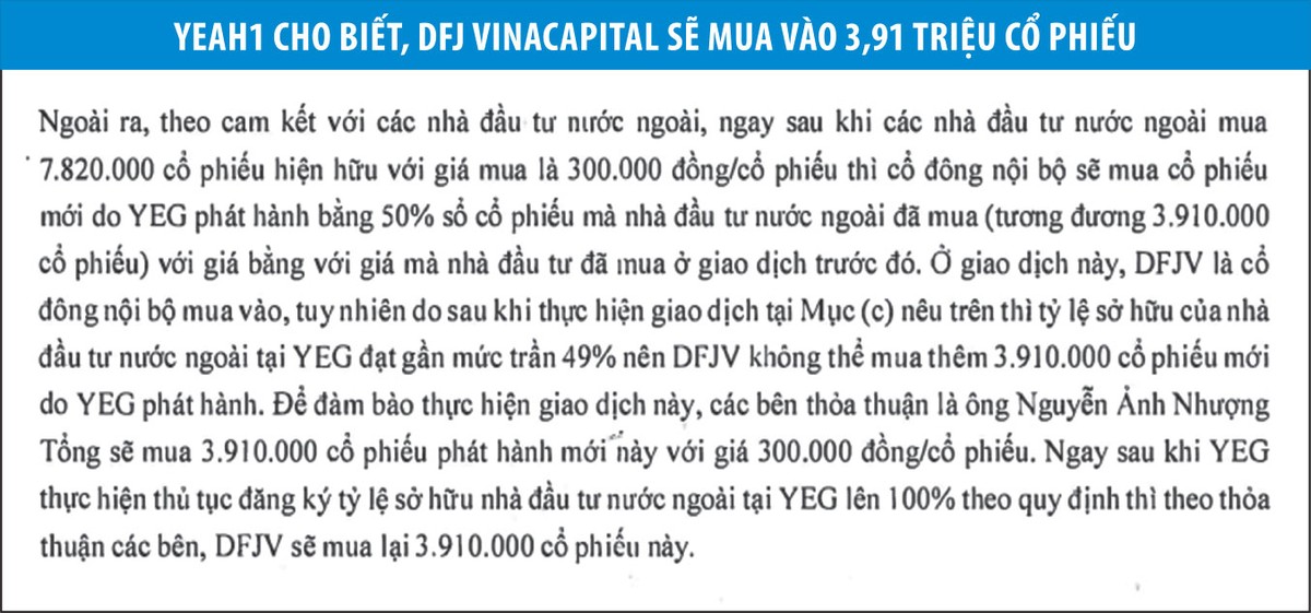 Như vậy, bản chất các giao dịch này - như giải trình - được hiểu rằng, DFJ VinaCapital bán ra 7,82 triệu cổ phiếu cho nhà đầu tư ngoại giá 300.000 đồng/cổ phiếu; ông Tống chuyển nhượng 3,91 triệu cổ phiếu YEG qua trung gian (là ông Tấn) để từ trung gian sẽ bán lại cho DFJ VinaCapital và sẽ mua lại 3,91 triệu cổ phiếu qua phát hành riêng lẻ. Yeah1 sẽ thu được gần 1.200 tỷ đồng từ thương vụ này.