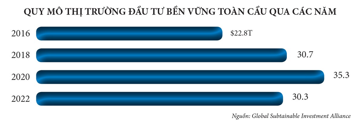 Theo số liệu của Bloomberg, tính tới năm 2022, các tài sản ESG trên toàn cầu vào khoảng 30.000 tỷ USD và con số này sẽ tăng lên gấp đôi cho tới năm 2030. Tất cả các nhà đầu tư định chế đều có chiến lược phân bổ vốn đầu tư cho ESG.